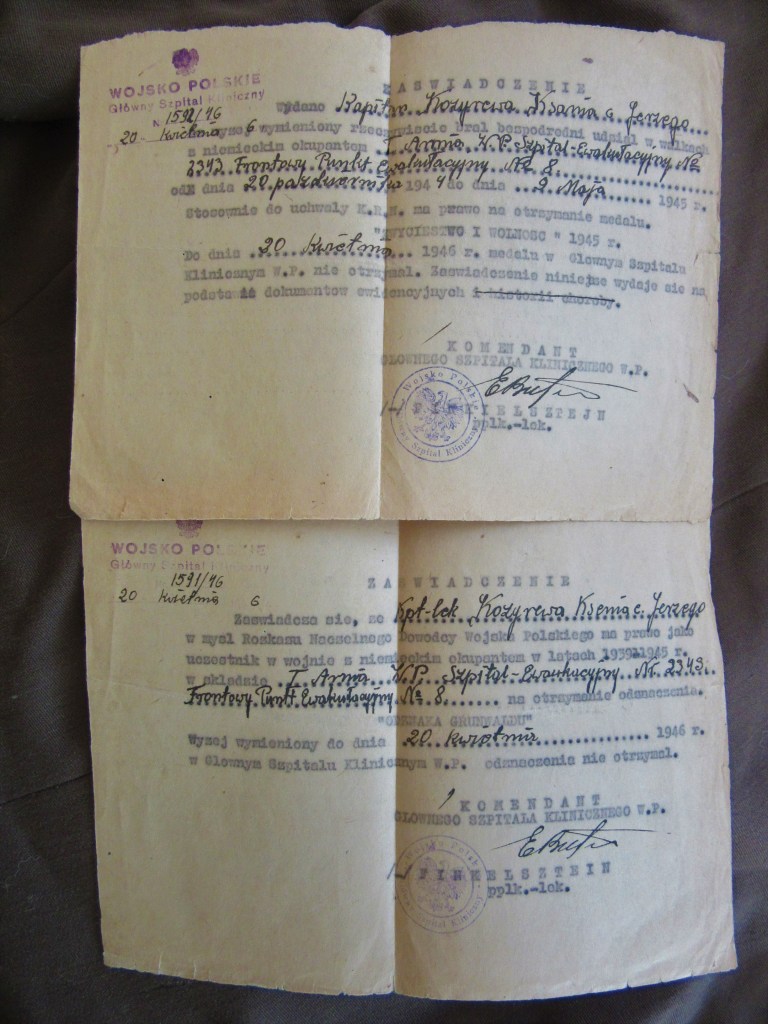 Pomimo wystawienia przez komendanta Głównego Szpitala Klinicznego WP, ppłk Finkelsztajna zaświadczeń o przysługujących odznaczeniach, najwyraźniej kapitan Kozyriewa nigdy nie wystarała się o nadanie medalu „Zwycięstwa i Wolności” i Odznaki Grunwaldzkiej.