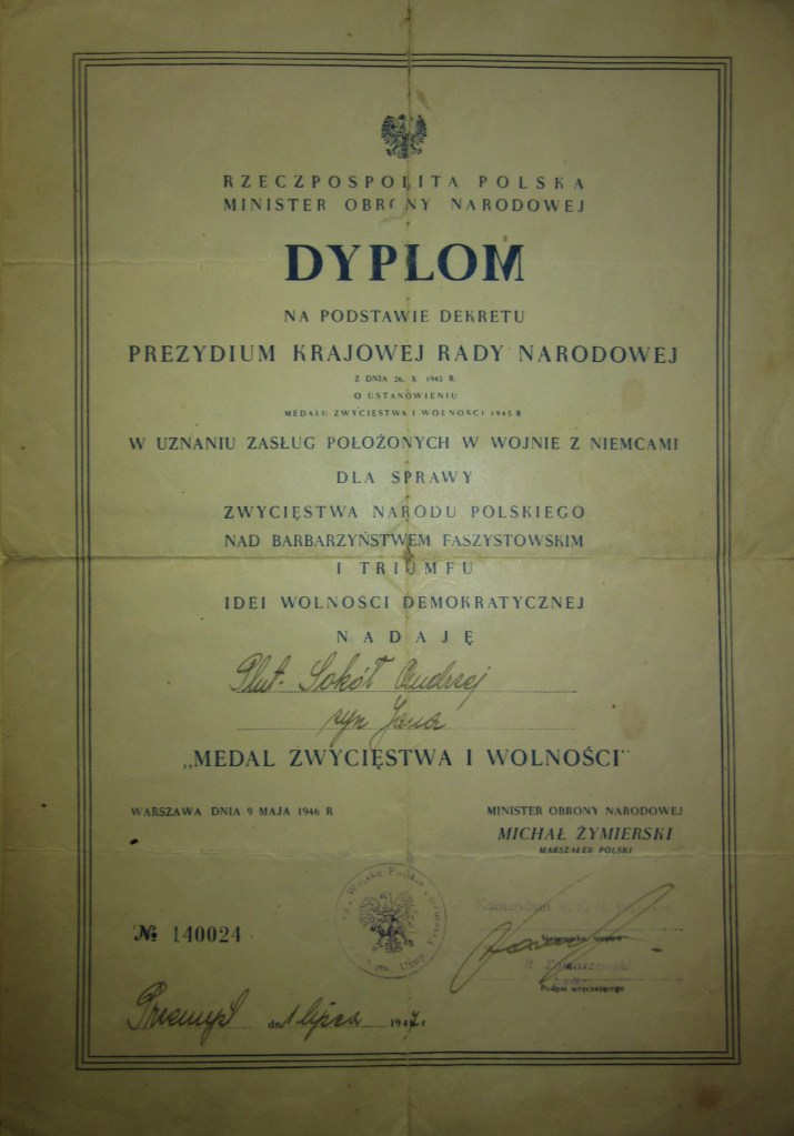 20 listopada 1945r. Został zdemobilizowany. Według monografii 1pp, dwukrotnie był odznaczony brązowym medalem „Zasłużonym na Polu Chwały”. Dokumenty tych odznaczeń nie zachowały się, jednak wraz z całym zestawem trafił w moje ręce jeden z tych medali, bardzo zmęczona wersja produkcji radzieckiej. Jej stan oraz pochodzenie wskazują, że przynajmniej jeden z medali otrzymał jeszcze pozostając w służbie wojskowej, choć nie było to nadanie za Lenino.