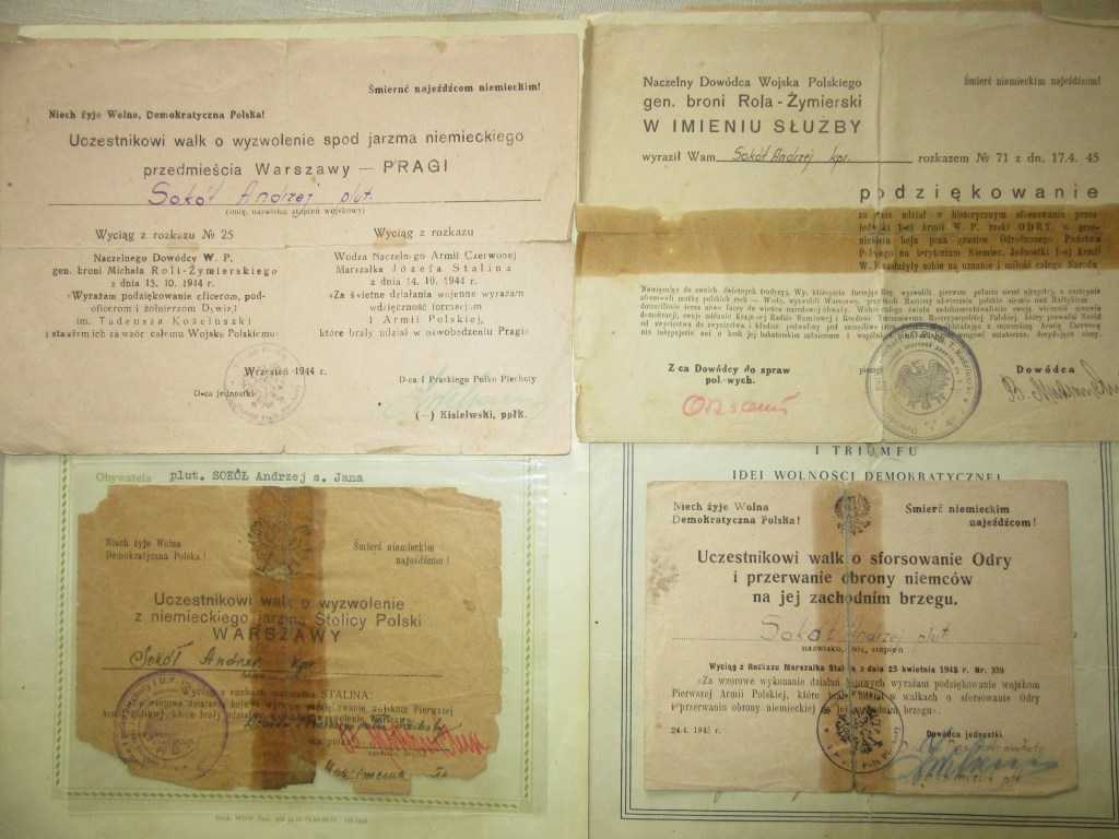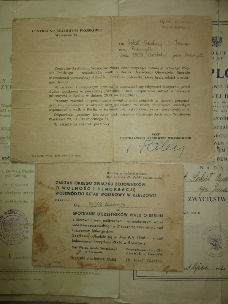 Książeczka podaje, że przebył szlak od Lenino do Berlina, jednak to samo źródło podaje, że na front odszedł dopiero po ukończeniu wszystkich kursów we wrześniu 1944r. Zapewne więc więc zaburzona jest chronologia i do szkoły podoficerskiej trafił dopiero po bitwie pod Lenino, tym bardziej, że dyplom awansowy z 1973r. podaje dokładnie, że Andrzej Sokół był uczestnikiem tej bitwy.
