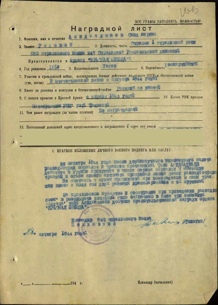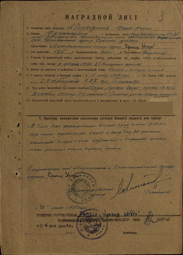 Za Okazane męstwo i nieustraszoność podczas wykonywania rozpoznania bojem'[,] w rezultacie którego wzięto do niewoli trzech niemieckich żołnierzy'[,] tow. Abidchadżajew zasługuje na odznaczenie państwowe – Order “Czerwona Gwiazda”