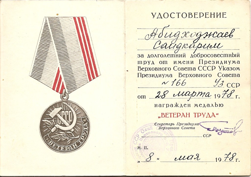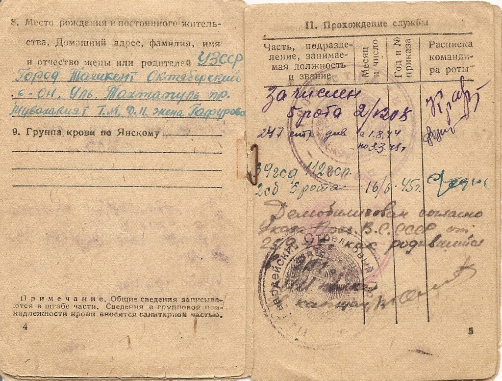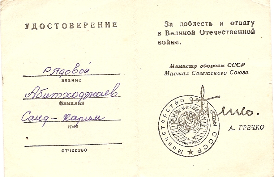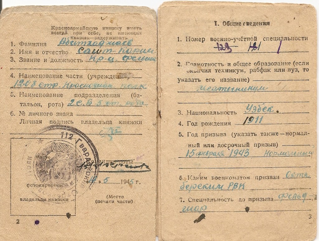 Ostatni mój artykuł poświęcony czerwonoarmistom poza Wojskiem Polskim (https://grh18pp.business.blog/2020/12/19/historia-pewnego-medalu/) prezentował sylwetkę przedstawiciela jednej z licznych w ZSRR mniejszości narodowych – Tatara. Tak się złożyło, że bohaterem niniejszego tekstu będzie Uzbek. Tym razem samych odznaczeń nie będzie. Zestaw dokumentów po szeregowym Abidchodżajewie nabyłem wiele lat temu i nigdy nie miałem możliwości nabycia jego orderów czy choćby późniejszych medali. Mimo wszystko uważam jednak, że historia jest ciekawa i zasługuje na osobny, choćby krótki artykuł.