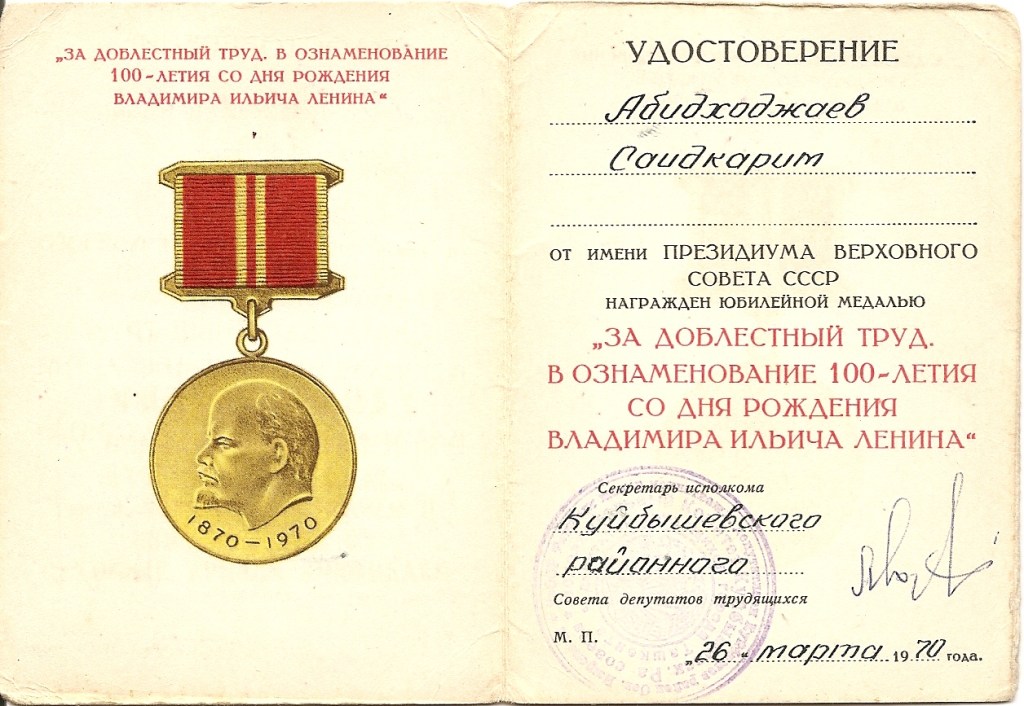 W tym samym 1970 roku otrzymał także medal za wybitną pracę na rocznicę stulecia urodzin Władimira Ilicza Lenina. Dokument wystawiony został przez Kujbyszewską Rajonową Radę Delegatów Robotniczych, co może wskazywać na kolejną przeprowadzkę.
