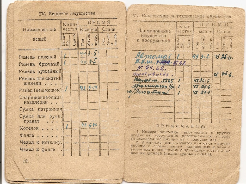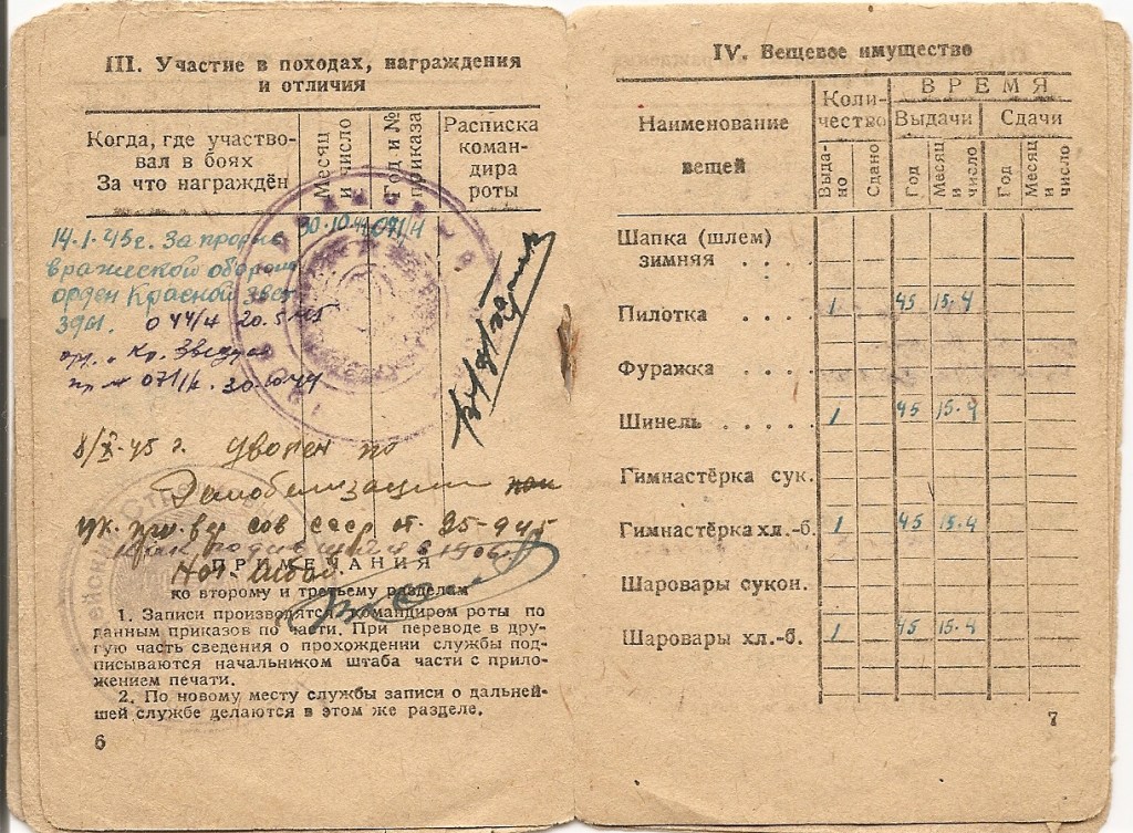 Na marginesie, z innej już perspektywy warto spojrzeć na wpisy w jego książeczce czerwonoarmisty – choć informacja jest niepełna i pochodzi głównie z maja 1945r., daje pewne wyobrażenie na temat tego jakie elementy umundurowania i wyposażenie mógł posiadać instruktor sanitarny.