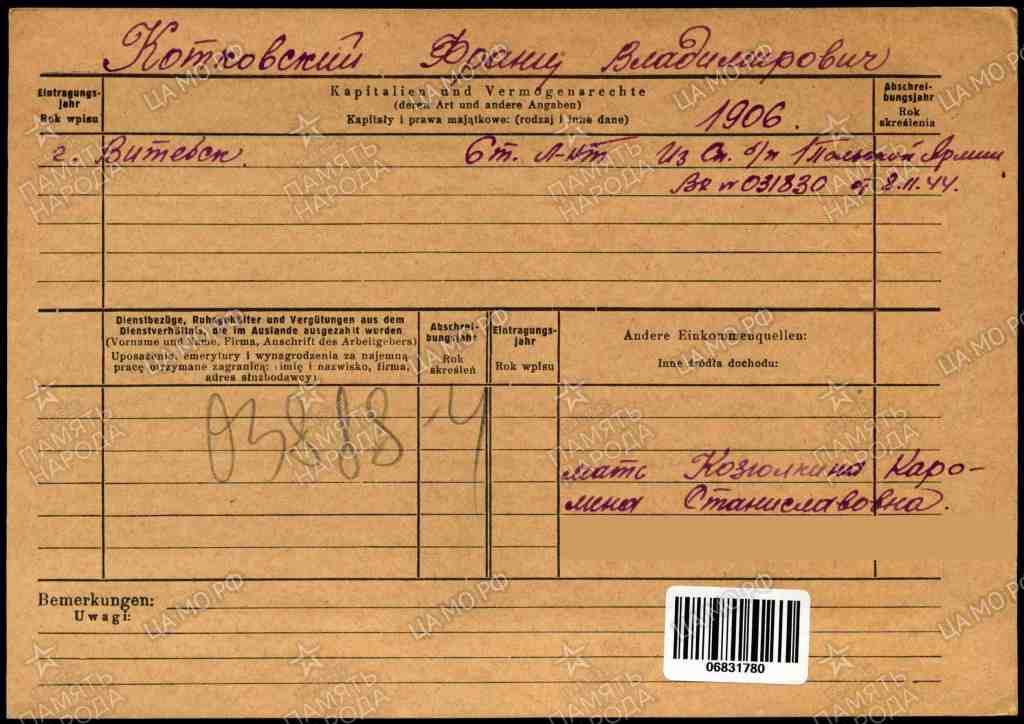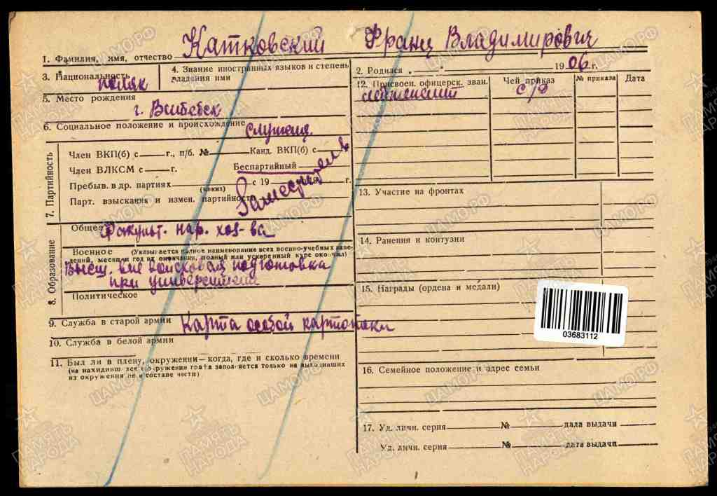„Podporucznik Katkowski F. W. w walkach 12-13 października 1943r. w rejonie wieś Trygubowo-Lenino. Nie bacząc na słaby stan własnego zdrowia za cały okres walk przezwyciężając trudności fizyczne nieprzerwanie dowodził i kierował swoją kompanią. Kompania rppanc w [nieczytelne – szczególnie?] trudnej ogólnej sytuacji bojowej została rozśrodkowana wzdłuż całego frontu batalionu na przestrzeni 600-700 metrów. Nie zważając na to podporucznik Katkowski nieprzerwanie wizytował wszystkie załogi rusznic przeciwpancernych.