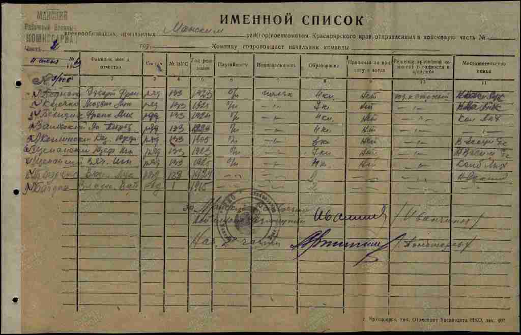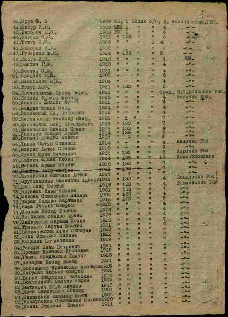 Józef Szczepański na liście rekrutów przekazanych przez Mański RWK do Krasnojarskiego WPP (CAMO RF).Józef Szczepański na liście rekrutów skierowanych przez Krasnojarski WPP do Obozów Sieleckich Moskiewskiego Okręgu Wojskowego (CA MO RF).