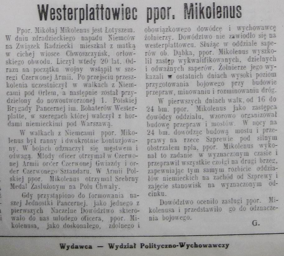 W czasie walki od 12.10 do 14.1043r. Chorąży Mikolepus N. A. pod silnym ogniem przeciwnika i bombardowaniu z powietrza przez samoloty osobiście dowodził ewakuacją czołgów, które utknęły podczas przeprawy w rejonie m. Lenino, wykazując się przy tym osobistą odwagą, śmiałością i wzorowewym dowodzeniem, w rezultacie czego ewakułowano trzy czołgi T-34 i jeden T-70.”