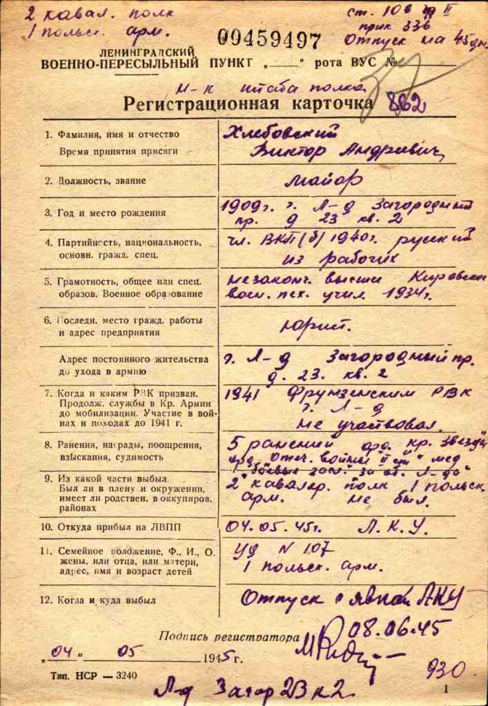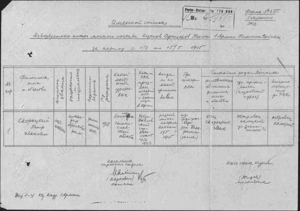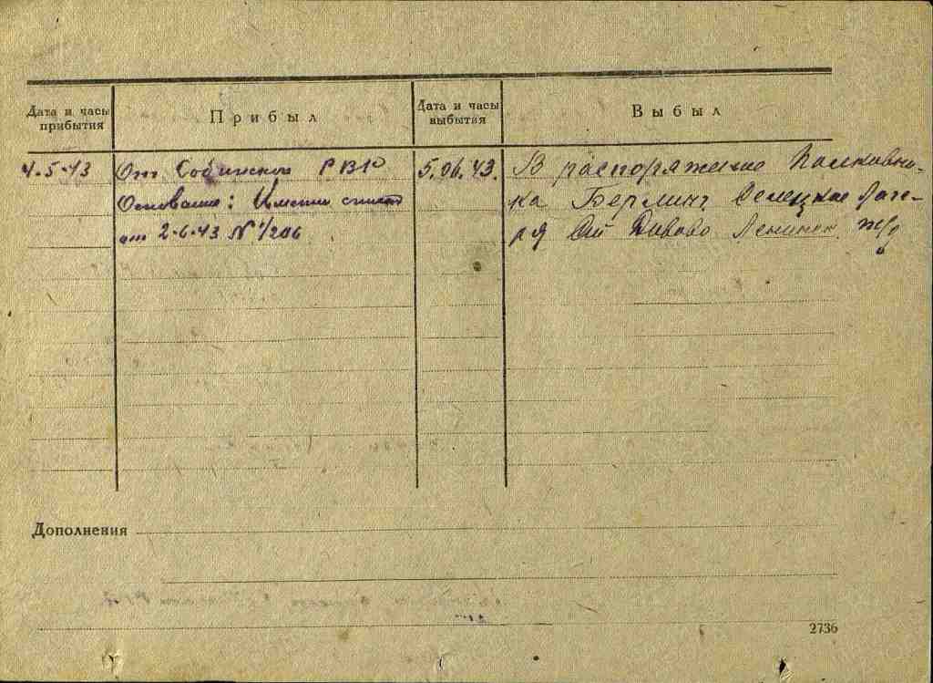 20.05.1943r. – skierowany do dyspozycji dowództwa Frontu Leningradzkiego.