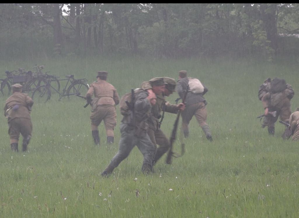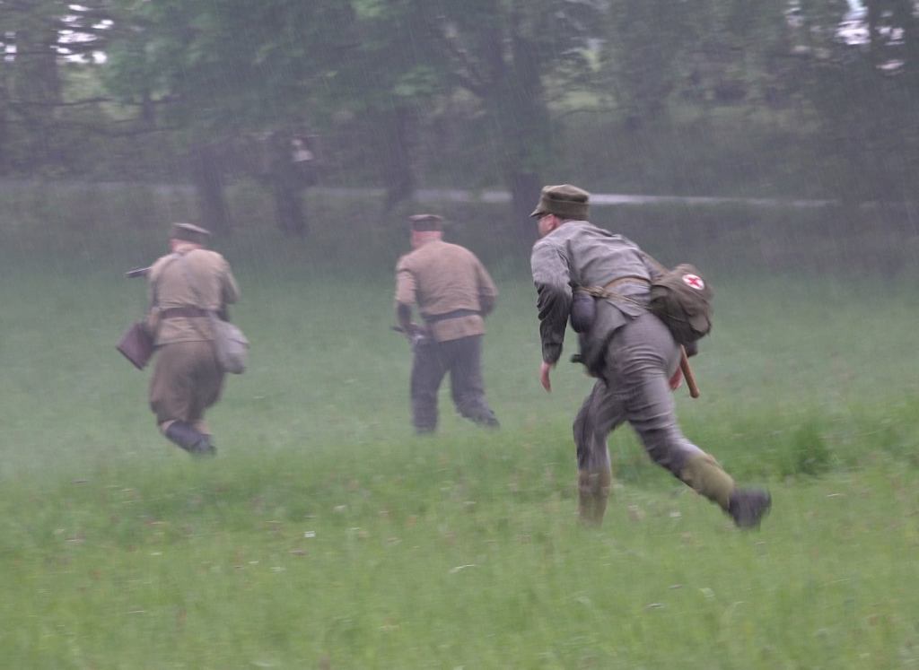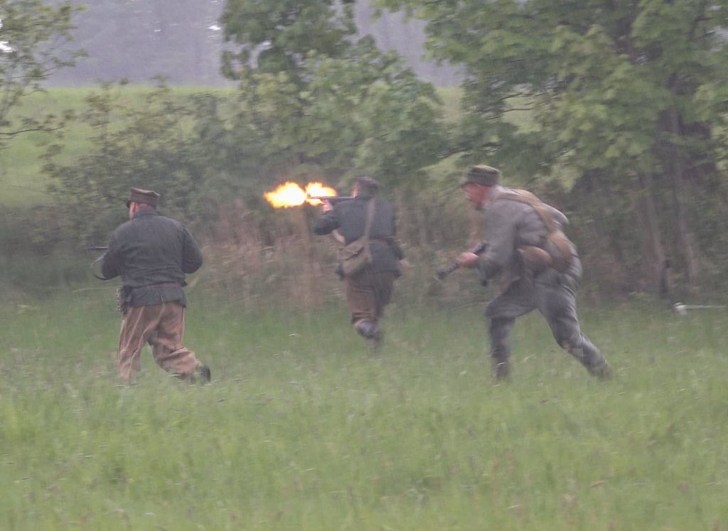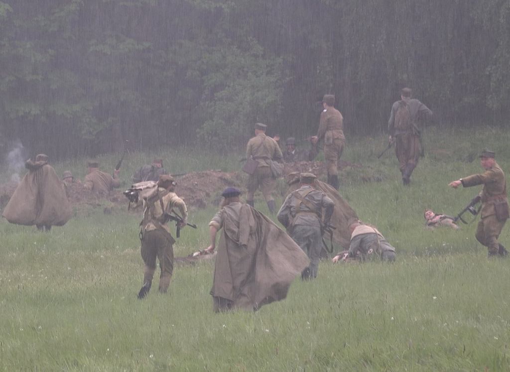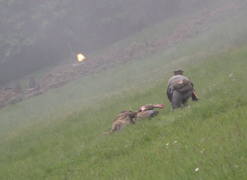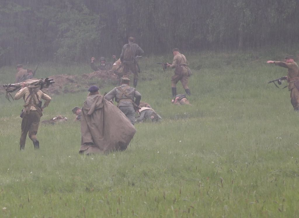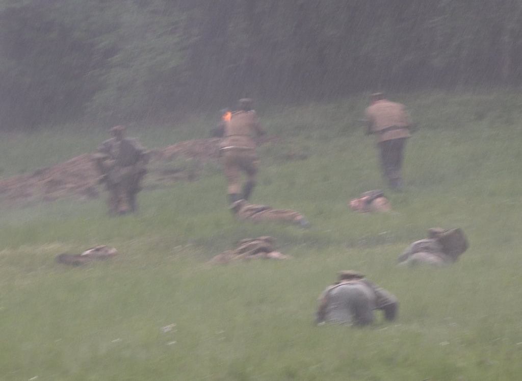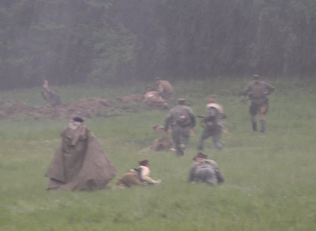 Ze względu na dość sporą odległość do niemieckich okopów oraz przemieszczanie się polskiej piechoty krótkimi skokami w dwóch drużynach, całość nie skończyła się zbyt wcześnie, a jednocześnie nie było wrażenia sztucznego przeciągania natarcia. Specyficznego klimatu tej części dodał deszcz, który zaczął padać na początku i bardzo szybko zamoczył trawę, w której czołgać się musieli rekonstruktorzy.