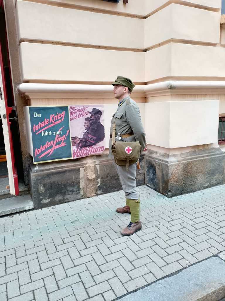 Pierwsza z sobotnich inscenizacji miała miejsce w samym mieście i przedstawiała gorączkowe działania niemieckich żołnierzy, volkssturmistów i pracowników administracji do obrony oraz wejście do miasta i walki żołnierzy 1AWP. Choć teren pod inscenizację był niewielki i wąski, został wykorzystany do maximum, a mury budynków ucharakteryzowane poprzez zawieszenie tablic, flag (na koniec zdjętych, podartych i rzuconych na ulicę) oraz obklejenie plakatami propagandowymi z końcowego okresu wojny. Także na bruk ulicy poleciały ulotki i pogubione oficjalne dokumenty. Warto podkreślić, że w toku inscenizacji wykorzystano także wnętrza budynków – nie tylko cześć obrońców z nich wychodziła, ale także zerwanie niemieckiej flagi wymagało wejścia na piętro budynku. Z jednego z okien w finale inscenizacji padły także strzały.