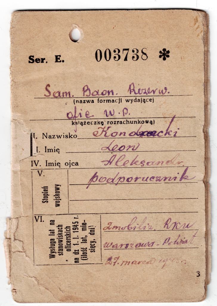 Niedawno na jednej z fejsbukowych grup natknąłem się na prezentację dokumentów po byłym partyzancie PAL kapitanie Leonie Kondrackim. Jako że w moim posiadaniu znajduje się kilka pamiątek po tej osobie, skontaktowałem się z właścicielem. Pan Fabian Dąbrowski nie tylko zgodził się na „wymianę skanów” ale jeszcze podzielił się na potrzeby tego artykułu dokładnymi skanami oficerskiej książeczki uposażenia oficera. Dokument ten jest o tyle ciekawy, że wystawiony został jeszcze w czasie wojny.
