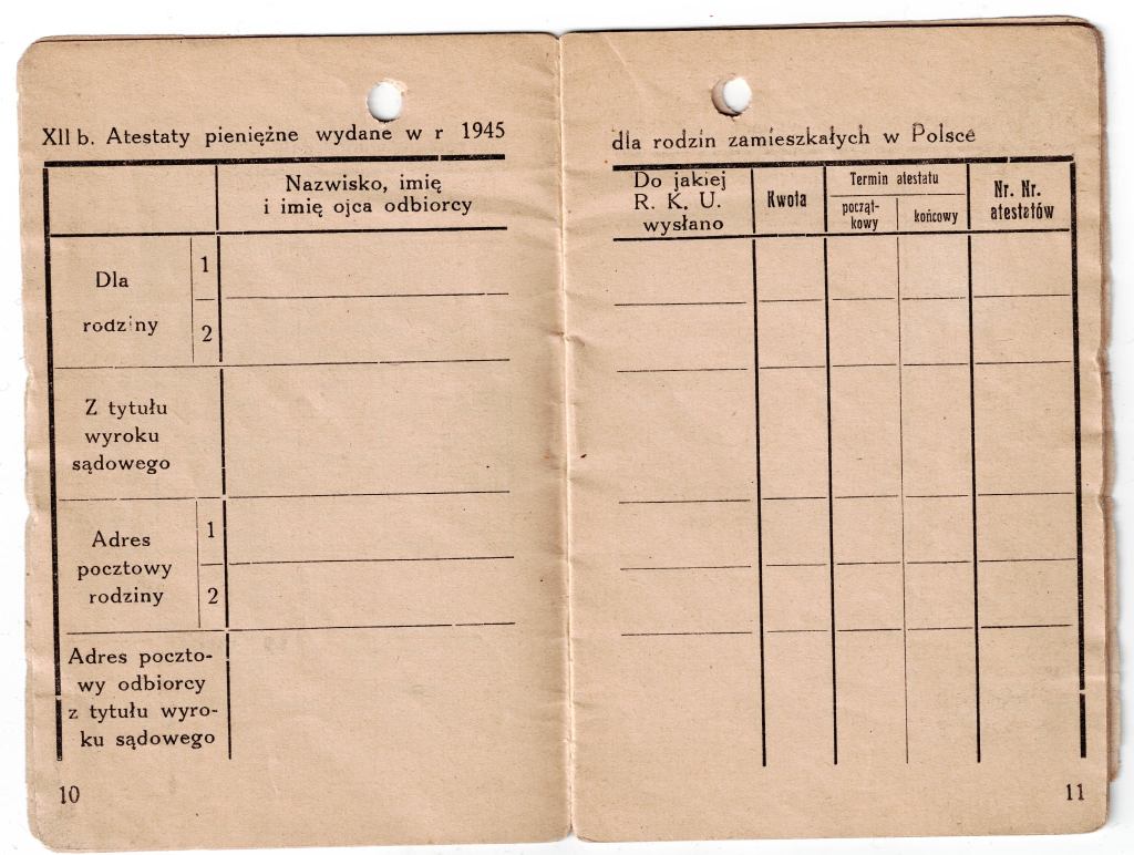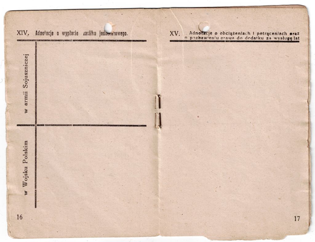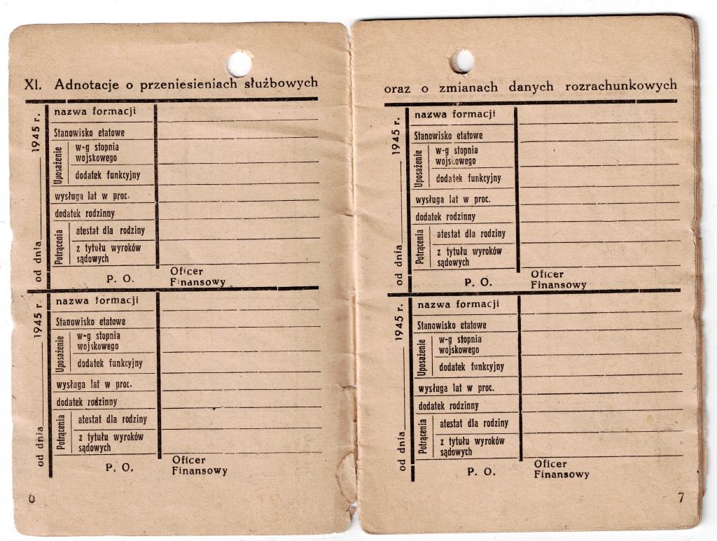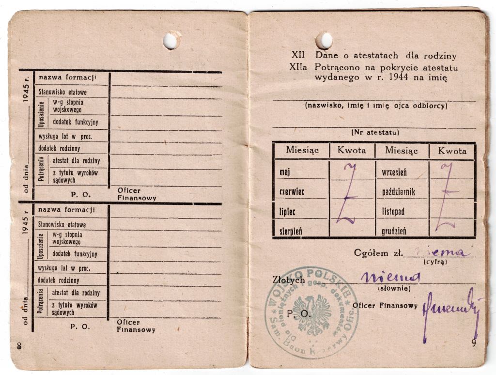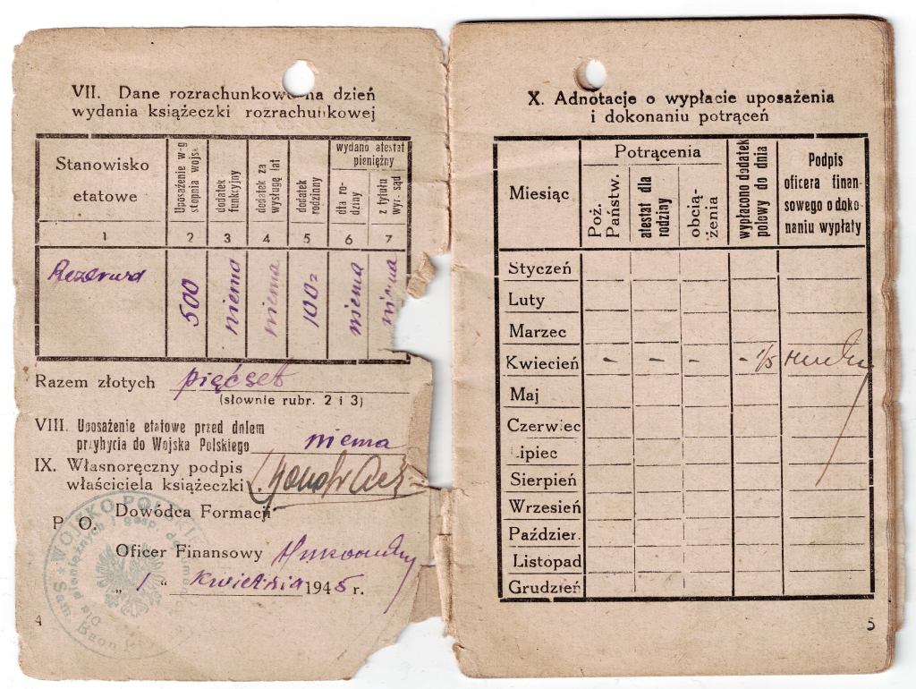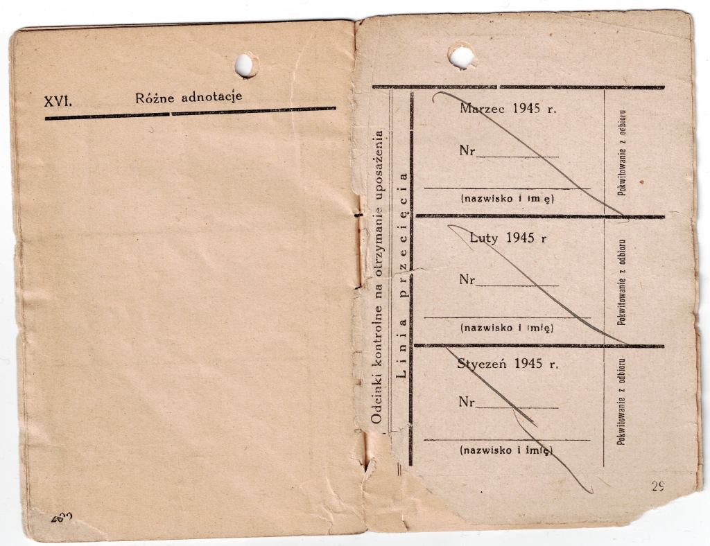 Od dawna byłem przekonany, że książeczki uposażenia – w jakiejś formie – funkcjonowały w jednostkach WP na Wschodzie. O ile na początku, gdy kwestie finansów i zaopatrzenia podlegały dowództwu radzieckiemu, takim dokumentem prawdopodobnie była radziecka „razciotnaja kniżka” (zaznaczam jednak, że to tylko przypuszczenie – nie widziałem takowej wystawionej dla oficera WP), o tyle w okresie późniejszym opracowanie osobnego wzoru wydawało się logiczne. Do tej pory wszystkie „wczesne” dokumenty tego rodzaju na jakie trafiałem, pochodziły najwcześniej z roku 1946. Dokument w zbiorach pana Fabiana wystawiony został 1.04.1945r. Adnotacje o wypłatach uposażenia zawierają rubryki odnoszące się także do stycznia, lutego i marca tego roku, co wskazuje, że planowo książeczka miała być używana od stycznia 1945r. Tym ciekawszy jest fakt, ze odcinki kontrolne zaczynają się od marca 1945r. (o ile nie brak tam strony). Może to sugerować, że dokumenty te powstały w lutym lub marcu 1945r. co z kolei może wskazywać na drukarnię WP w Toruniu jako źródło książecki. Na tę chwilę jednak jest to tylko teoria, gdyż w prezentowanym egzemplarzu brak okładki i pierwszej/ostatniej strony, nie sposób więc stwierdzić czy znalazła się tam informacja o drukarni lub dacie zamówienia.